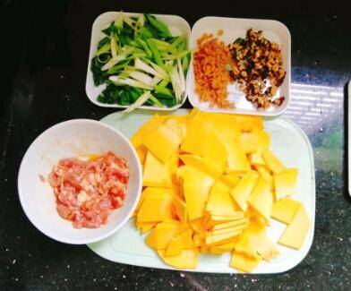 南瓜适量、干香菇3朵、蒜两根、萝卜干适量、猪肉适量、胡椒粉适量、蚝油适量、盐适量、味精适量、食用油适量。