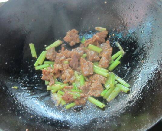 切点芹菜,茶油烧开,下入牛腩,翻炒。