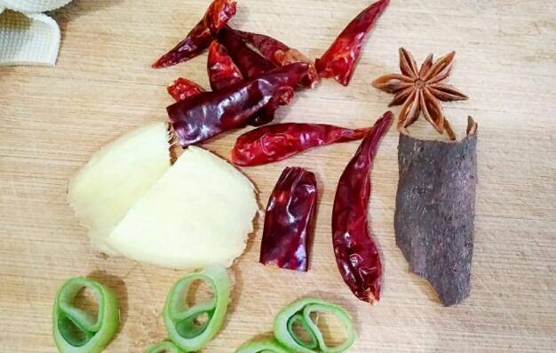 3、调料过水冲去浮尘,姜切片,葱、干辣椒切小段。