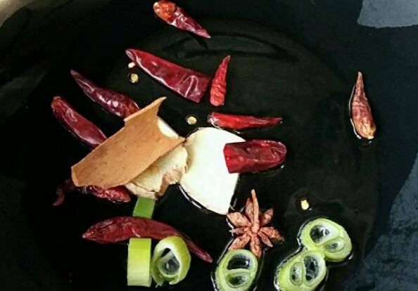 4、锅中少量油烧至7成热,下入葱、姜、干辣椒、八角、桂皮爆出香味儿。
