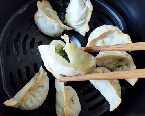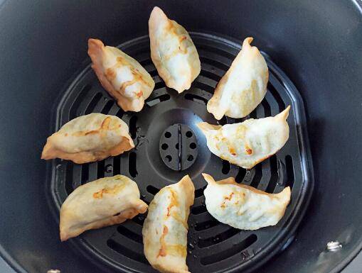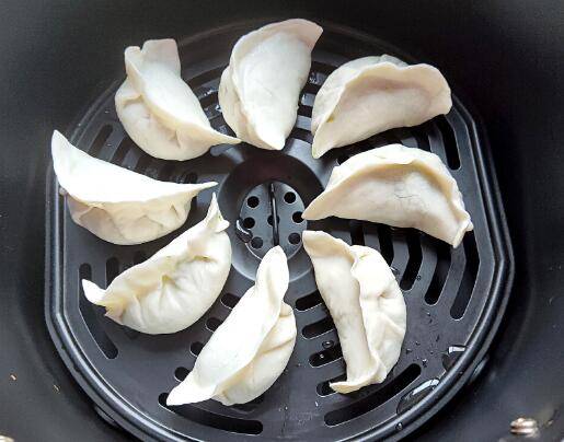 3、将饺子上多余的水甩掉,然后码好在空气炸锅的炸篮里,180度烤10分钟。