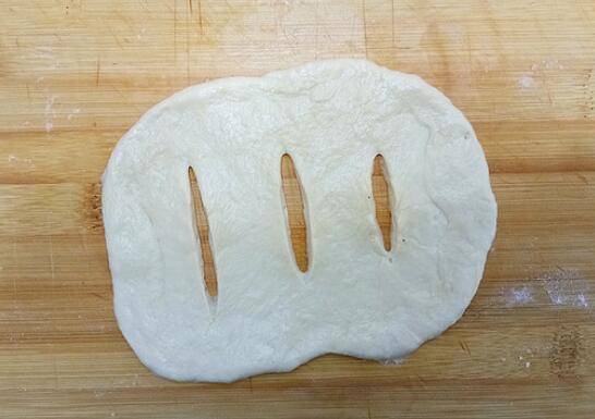5、取一份小面团擀成面皮,用刀在面皮上划三刀。
