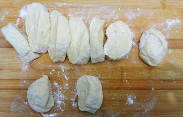 4、发酵好的面团在案板上稍微揉一下,按成长条状,切成小剂子。