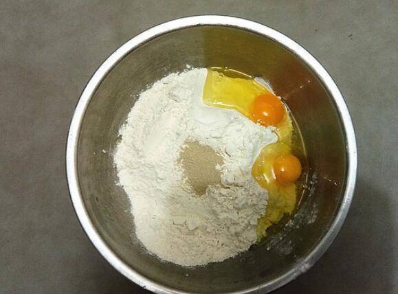 1、鸡蛋打入面粉中,加入酵母粉、食盐。