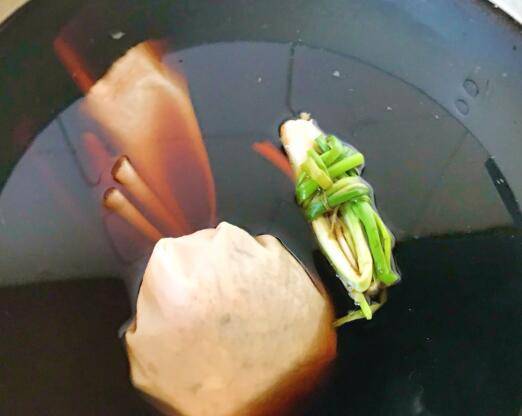 准备一只大锅,倒入能刚好淹没鹅肉的清水烧开后,加入卤料包,葱结,加入2勺鱼露、3勺生抽、3勺老抽和1片糖。
