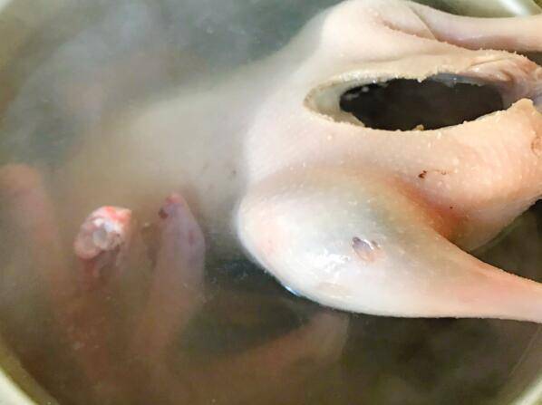 光鹅洗净,剪下脚和翅膀。锅中水烧开,放入鹅,煮5分钟。