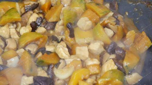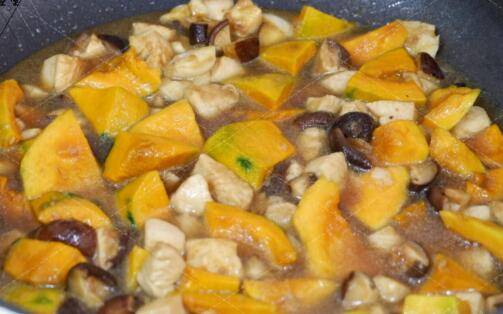 加入南瓜翻炒均匀,倒入酱油,加入没过食材的清水,大火煮开后加盖转小火将所有食材炖软。
