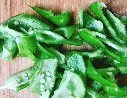 青椒去籽去蒂切片。