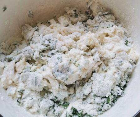切碎的韭菜叶放入面粉中,加入适量盐,搅拌均匀后加水,边加边搅拌至没有干面粉,和成一个偏软的面团。
