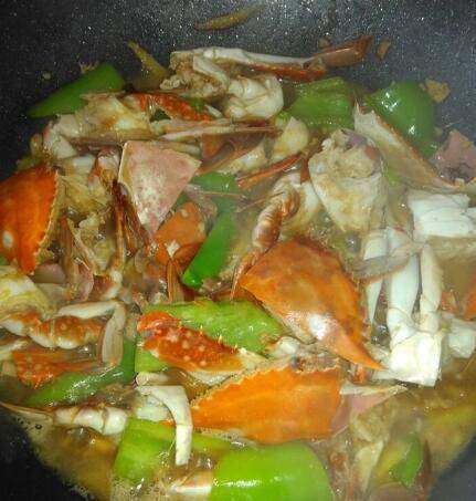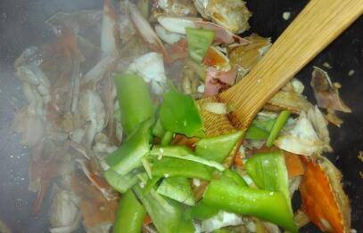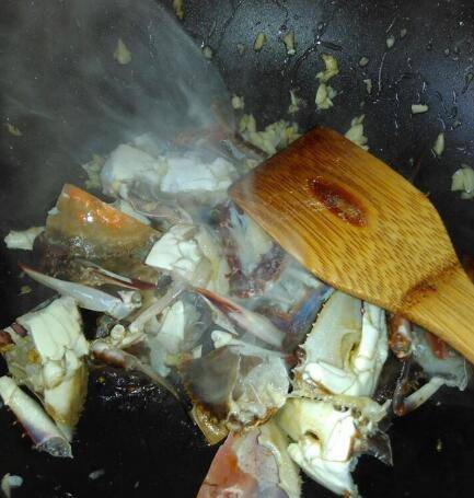 把螃蟹放下去炒制少会,倒适量料酒,生抽继续炒。