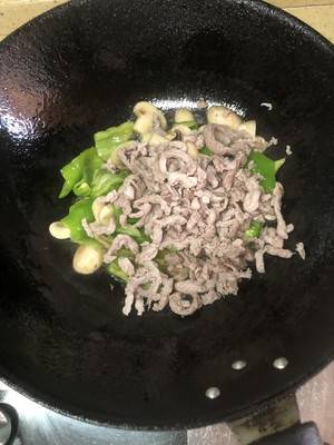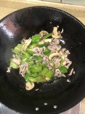 用料:青椒2个、肉丝200克、姜2片、盐适量、蘑菇5-6个。