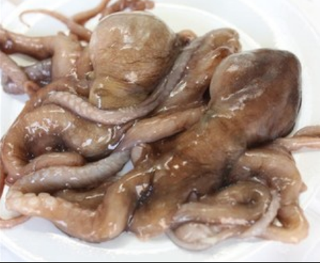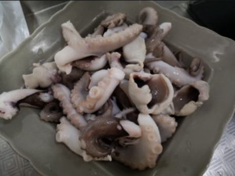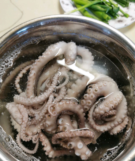 2、新鲜的八爪鱼沸水烫一下,备用。