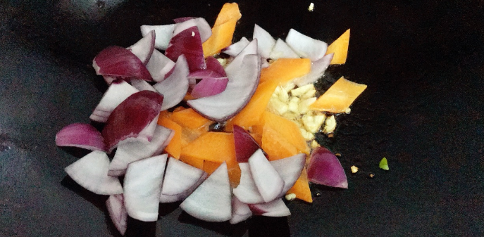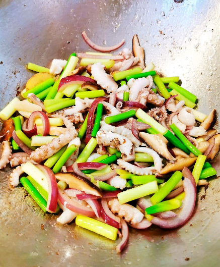 3、热锅放入植物油,油热后放入姜片和蒜片,出香后放入香菇,洋葱,蒜苗大火翻炒均匀。菜变色后放入八爪鱼迅速翻炒。