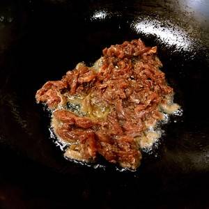 7、再放入适量底油,放入处理好的牛肉。
