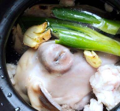 汆水的羊头放入砂锅中,放入大块的姜块和大葱段,添入足量的清水。以熬煮的中间不再添水为宜。