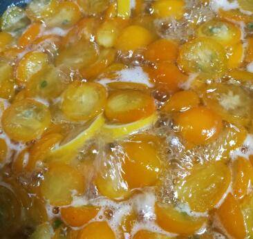3、腌好的金桔柠檬倒入锅内,加150毫升水中小火煮开,小火慢炖,中间经常翻拌,防止糊锅。