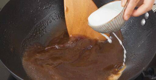 9、将锅中的料头捞出,弃之不用。锅中的酱汁加入2-3大勺水淀粉小火煮开勾芡。