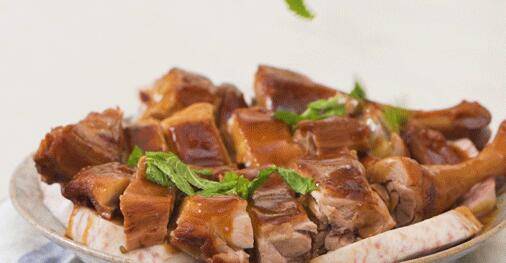 10、蒸熟的芋头垫底,摆上切件好的鸭腿,淋上酱汁。