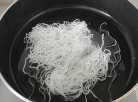 再把大排加入挂糊,热锅倒油,油温7分热先把粉丝加入至膨胀后捞起。