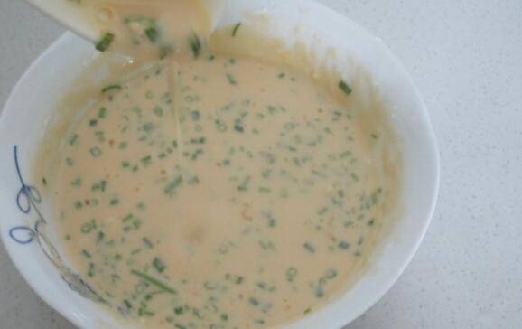 再把混合粉里加入鸡蛋,2克盐,葱花拌匀后再慢慢的加入清水,边加边搅拌用调羹试试,能挂住糊即可,静置10分钟。