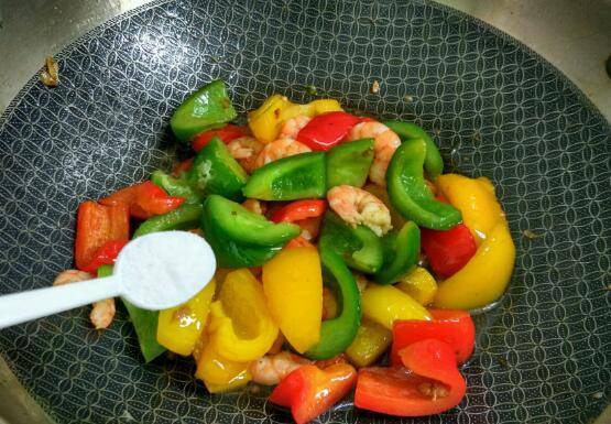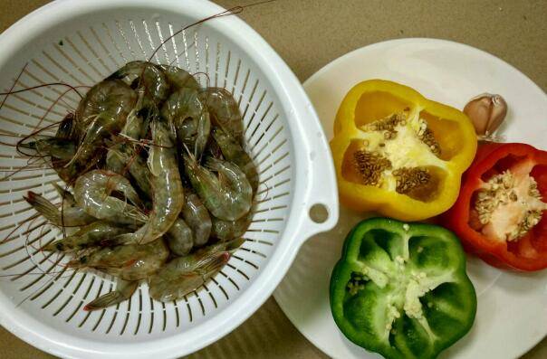 用料:虾250克、青椒半个、红椒半个、黄椒半个、大蒜2瓣、盐1小勺、鸡精半小勺、蚝油半勺、酱油半勺、植物油适量。
