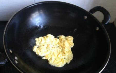 4、倒入鸡蛋,炒匀盛出备用。