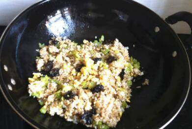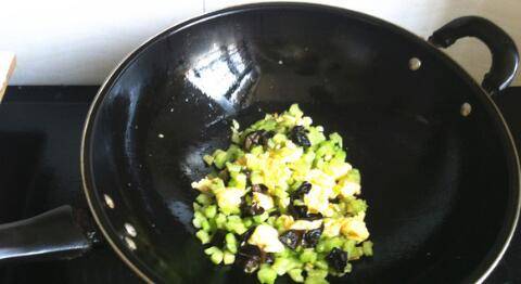 6、米饭均匀上色,倒入炒好的苦瓜木耳鸡蛋,翻炒。炒匀出锅。