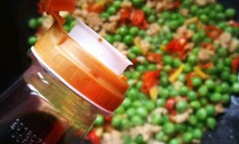 倒入辣椒和姜蒜爆香,倒入焯水后的豌豆大火快速翻炒。