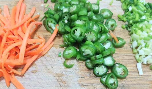 胡萝卜、青辣椒、香葱等洗干净,切好备用。