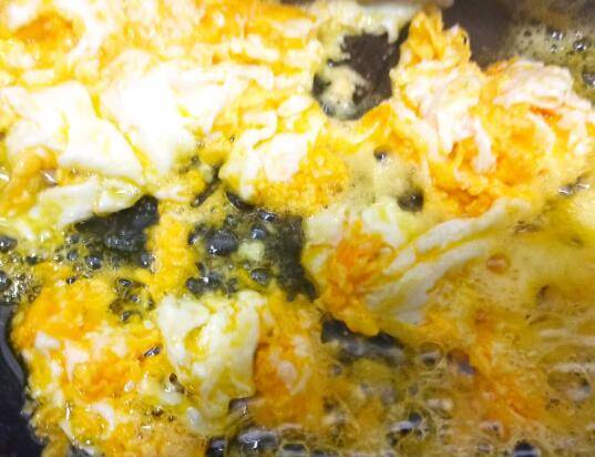 油烧热,拿两个鸡蛋敲在锅里,鸡蛋炒熟。