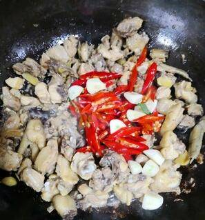 放入泡椒,大蒜粒,翻炒一会儿。