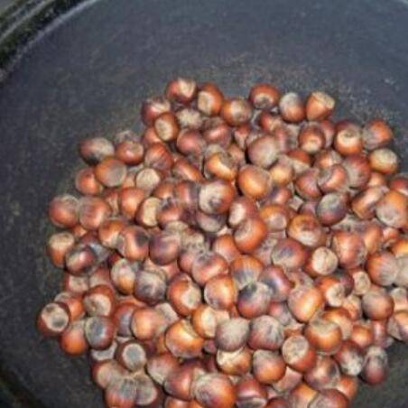 4、榛子的外表出现黑乎乎的油亮,也可以闻到一股木头的清香,再翻炒几分钟即可装盘食用。