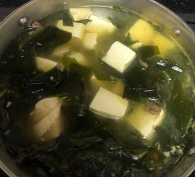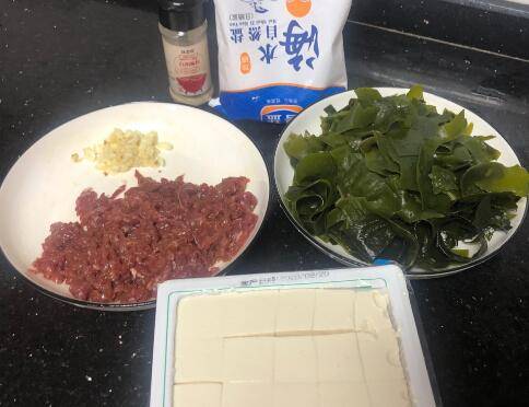 用料:牛肉150克、水豆腐1盒、裙带菜100g、白胡椒粉小半勺、蒜末两小瓣、盐适量、酱油半勺。
