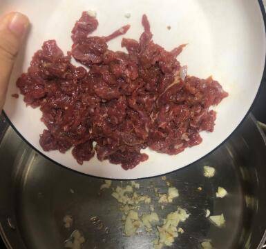 3、锅里倒一勺油,把蒜末倒进去爆香,然后把牛肉倒进去炒熟。