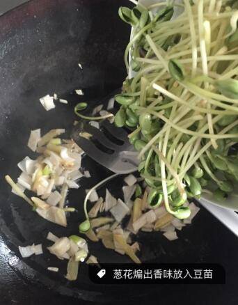 3、葱花出香味后倒入豆苗。