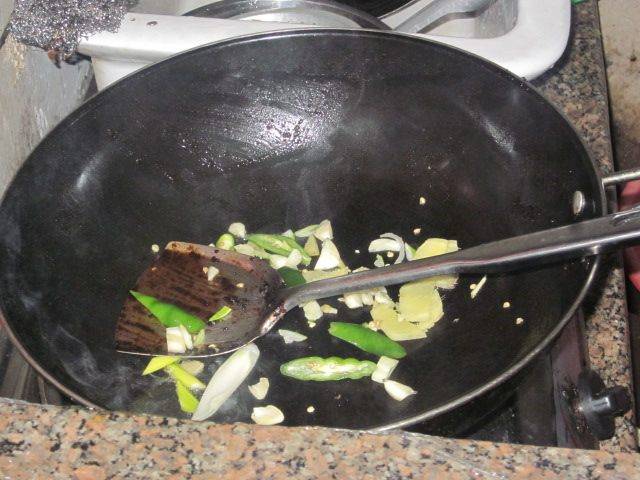 4、倒入鱿鱼,加适量料酒、生抽、香菜,大火翻炒。