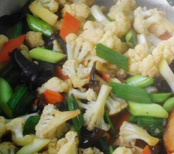 用料:花菜1棵、胡萝卜50克、黑木耳5克、青蒜2棵、蒜2瓣、鸡汤少量、酱油1汤匙、水淀粉少量、盐适量、花生油适量。