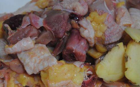 板栗200克、土鸡900克、料酒2瓷勺、蚝油1瓷勺、酱油1.5瓷勺、清水大半碗、姜片3片、胡椒粉1量勺。