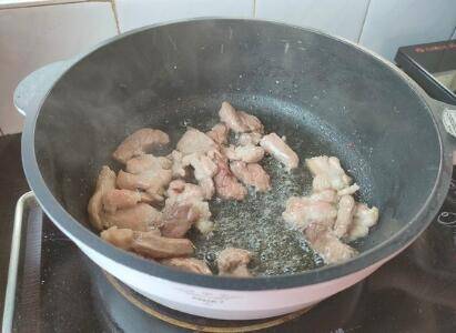 起锅热油,下肉片翻炒,加入一勺料酒,翻炒均匀。