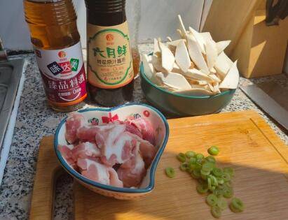准备好食材跟配料,鸡腿菇洗净切片,猪肉也切成薄片,再准备点葱花。