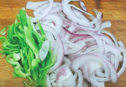 锅里再次放油, 加入洋葱、青椒炒到八成熟。