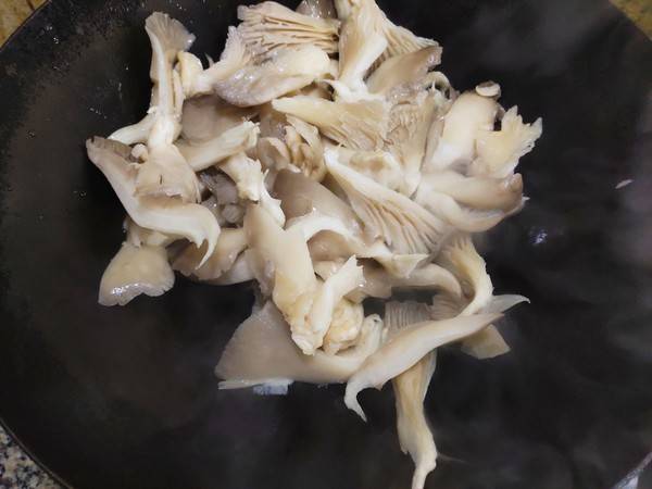 6、倒入平菇,翻炒一下。