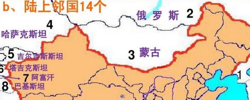 与中国接壤的国家共有14个,分别是尼泊尔、不丹、缅甸、哈萨克斯坦、吉尔吉斯斯坦、巴基斯坦、印度、老挝、越南、塔吉克斯坦、朝鲜、蒙古、俄罗斯、阿富汗。中国一直是东亚面积最大的国家,因此中国拥有极为漫长的边境线,中国陆地的边界线总长高达2.2万公里。