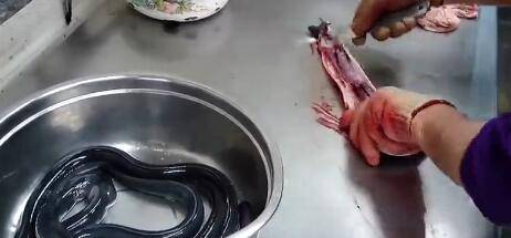 2、从头到尾破开鳗鱼的肚子。