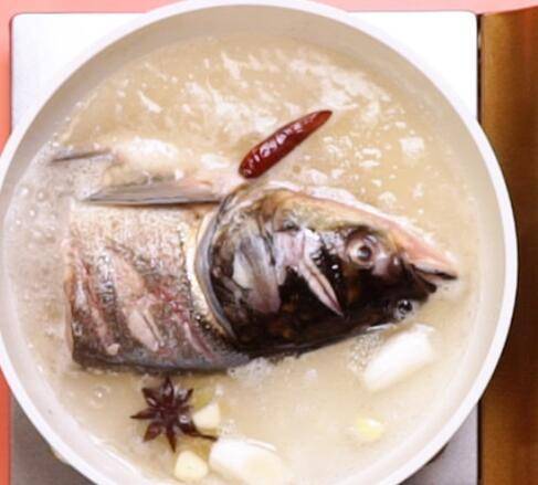 3、锅中放油,倒入鱼头,倒入葱段,姜片,蒜块,八角,干辣椒,料酒,翻炒均匀,加入清水,大火煮沸,转中火炖制。