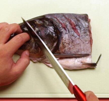 2、红椒切丝,鱼头打斜刀。