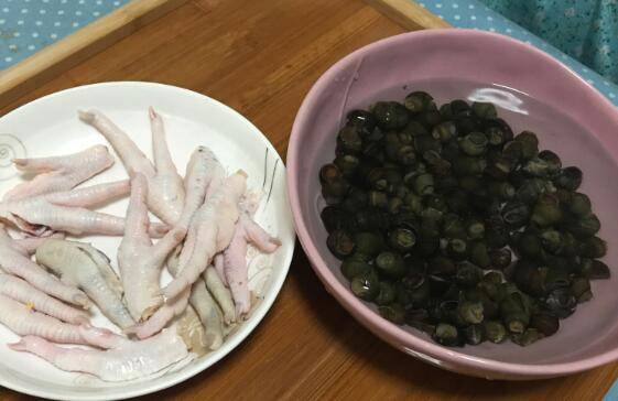 螺丝洗净泡水里,鸡爪洗干净对切备用。