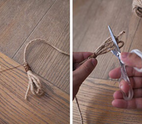 4、先用手掌缠绕出一段麻绳,并在终点处用颜色相近的细绳线缠绕,之后用美工剪将连接处剪齐。另一边也用同样的方法制作。