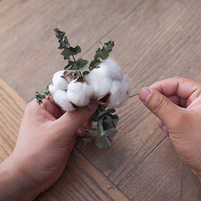 5、用细绳线将棉花和尤加利叶绑在一起,使棉花位于尤加利叶的中心处。