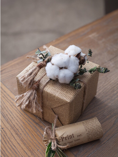 6、把棉花和尤加利叶的花束装饰在包装好的礼品盒上即可。